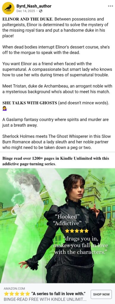 You’ll notice I didn’t post income numbers. I won’t be doing that as it lends itself to comparisons with other authors and can set unrealistic individual goals. My 2026 goal is to work towards a 50% increase from 2025. To achieve this, I need to write more books, AND advertise.